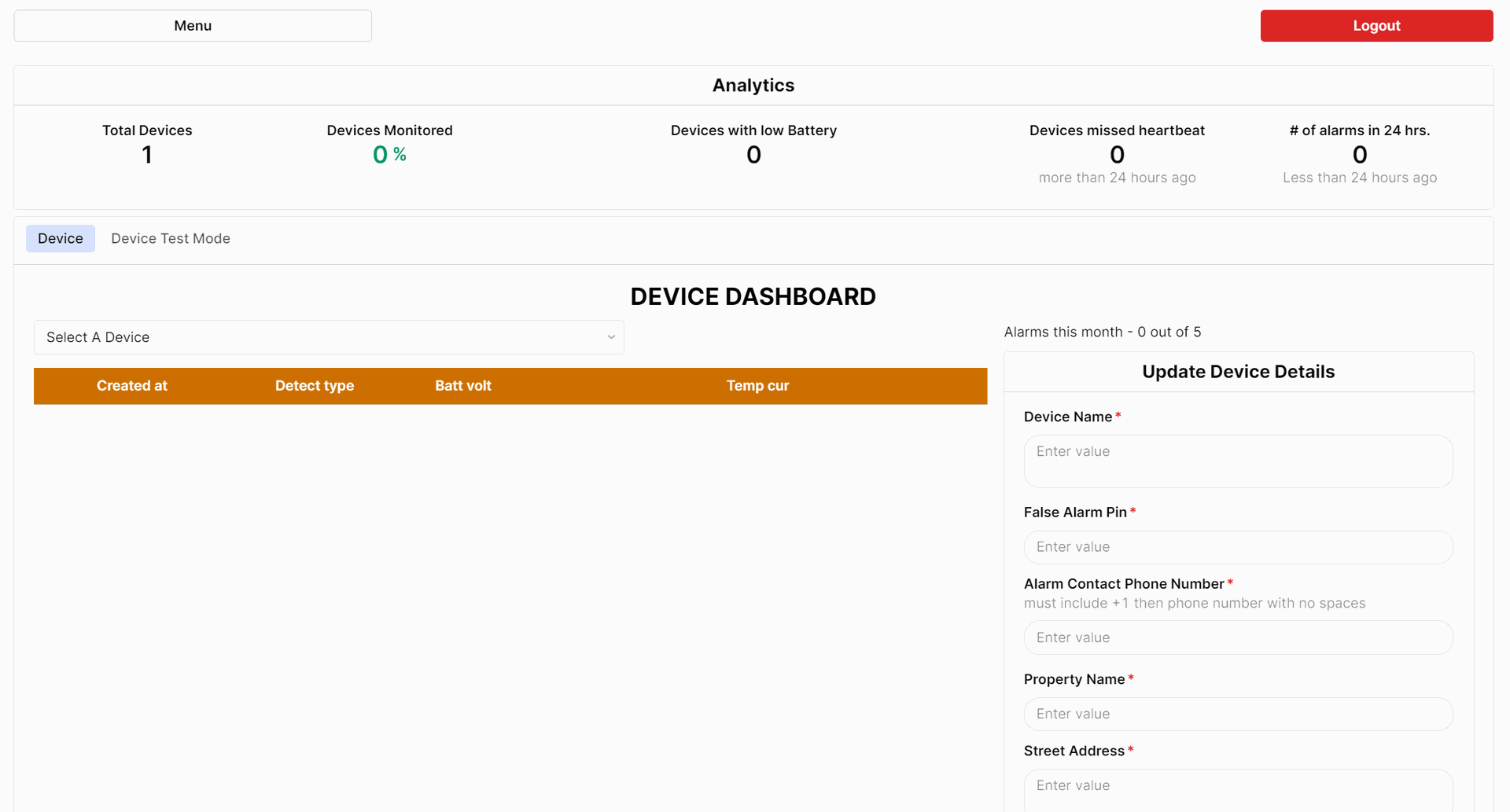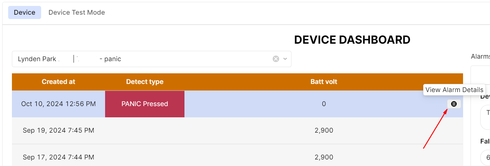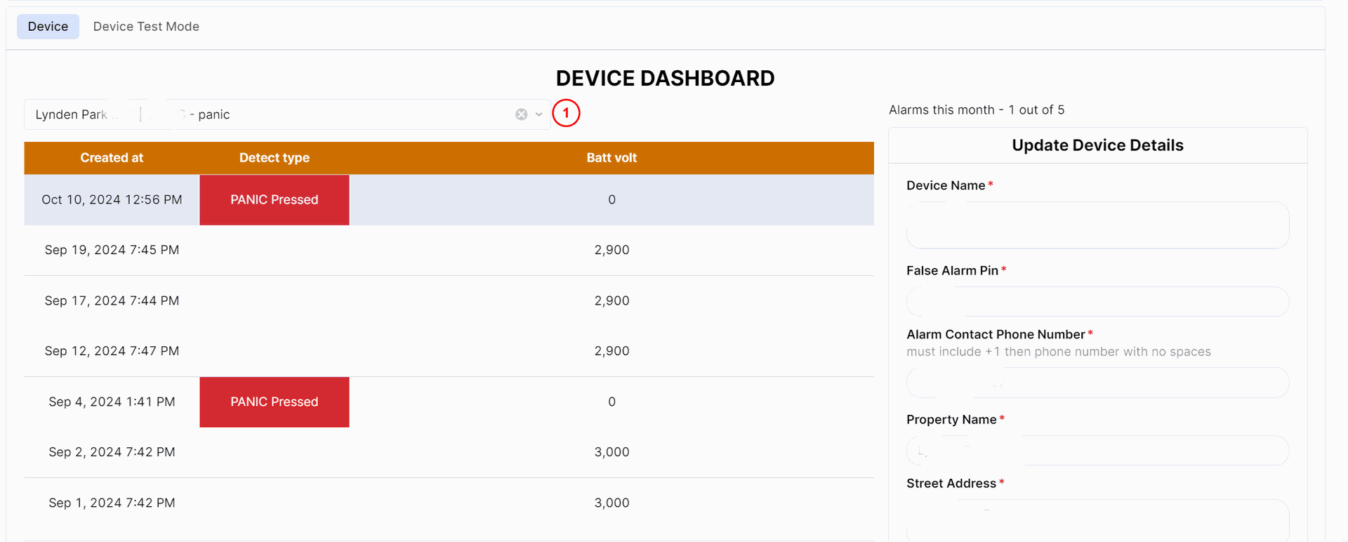- Select the device(1) from the device dropdown to load all panic alarms and heartbeats.