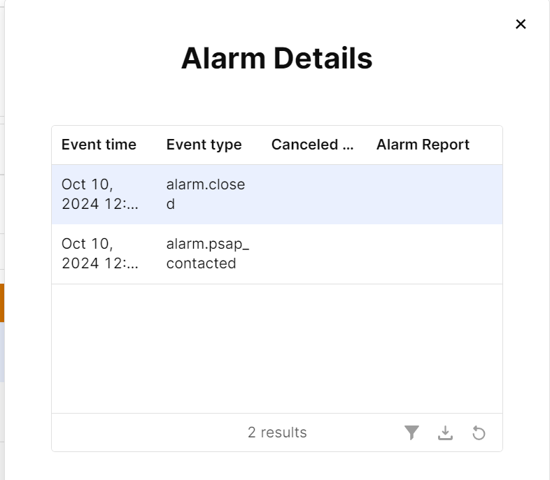 - A details popup box will show when the monitoring station was contacted and when the alarm was canceled. If the monitoring station has any details they will leave it in the "Alarm Report" field. The Alarm Report could take 24 hours to populate.