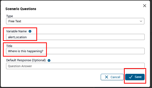 - Create the Scenario type, dashboard name, icon and color. "Sites" and "Scenario Questions" MUST BE SELECTED